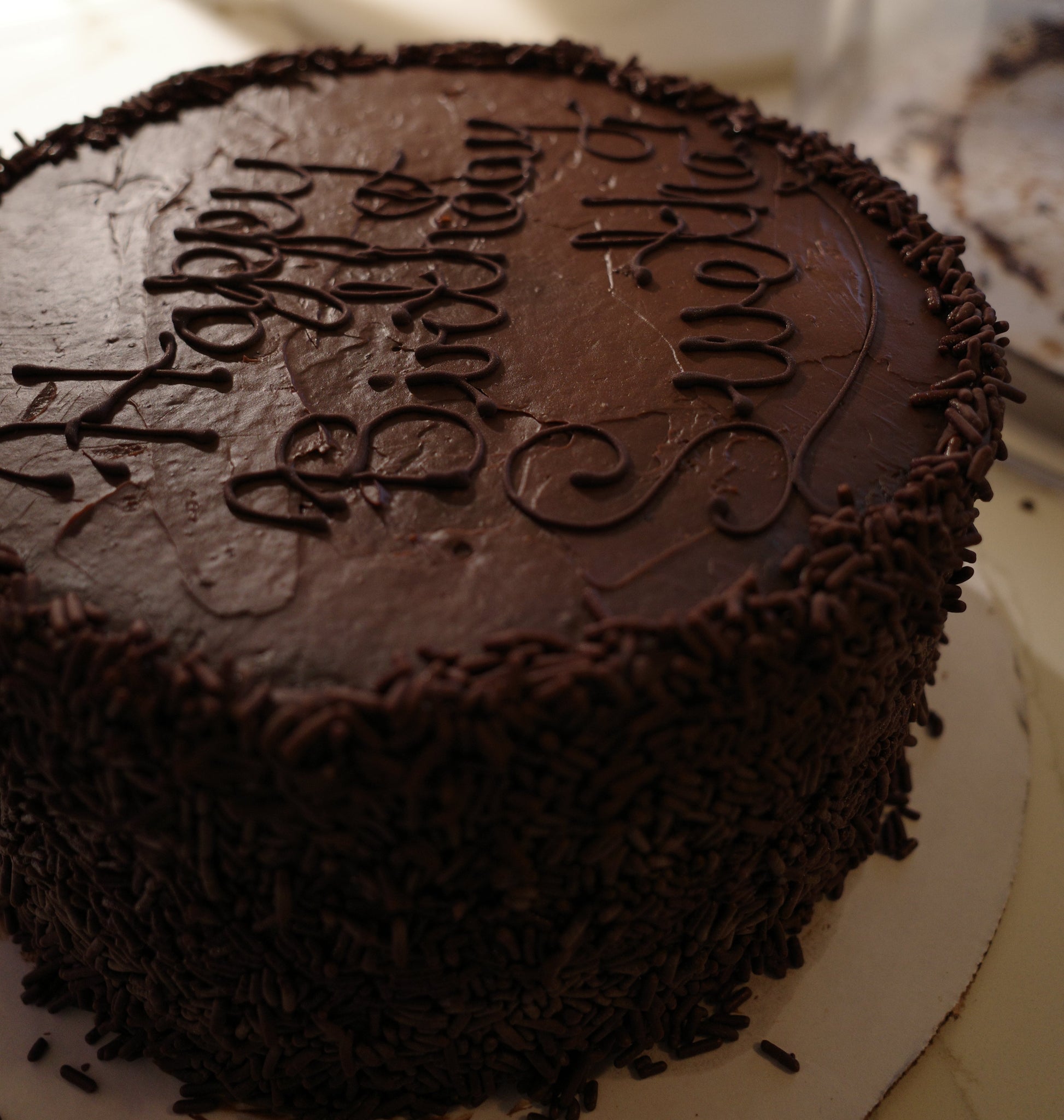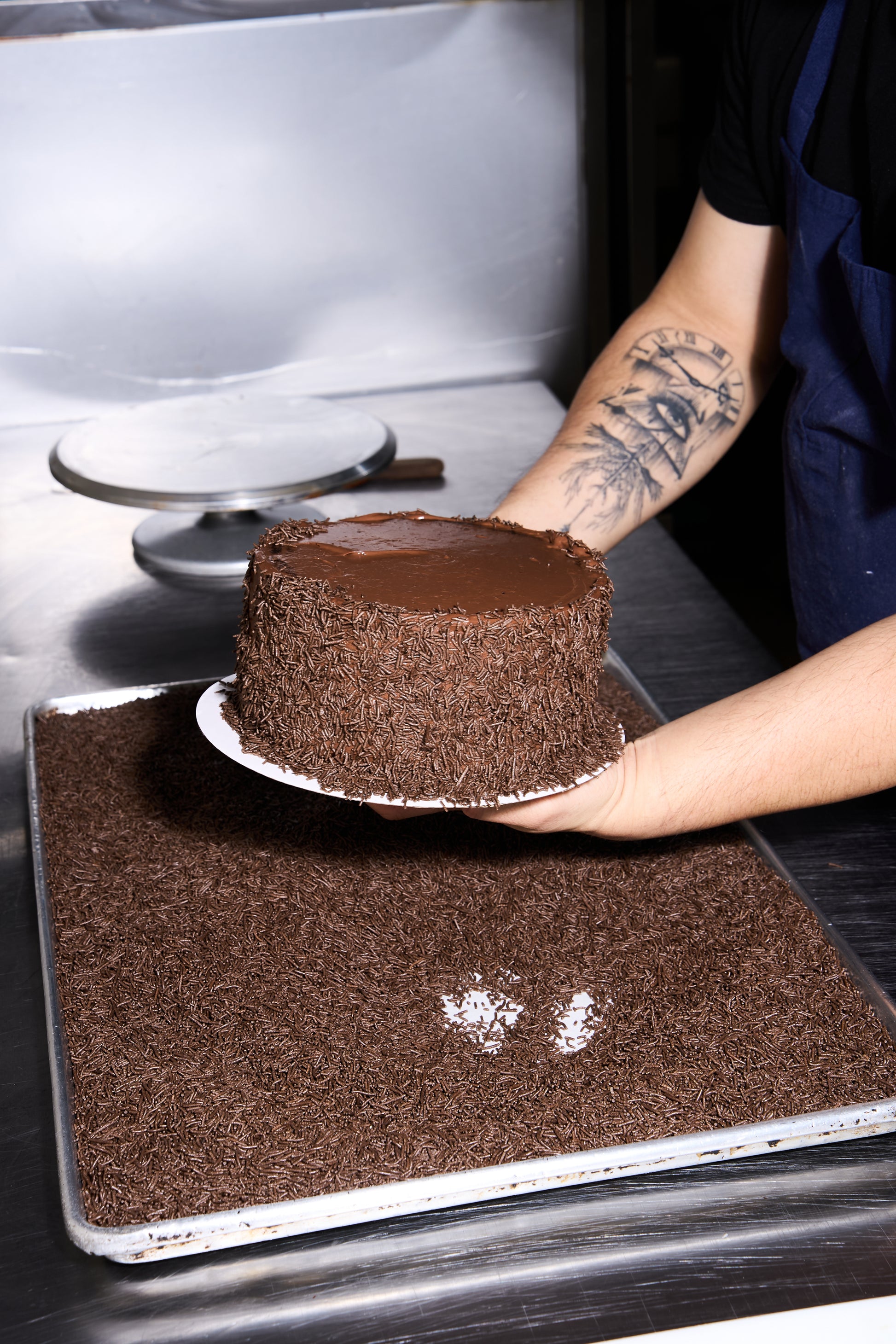 Indulge in a decadent blend of devil's food cake, topped with rich chocolate ganache and finished off with a sprinkle of more chocolate.