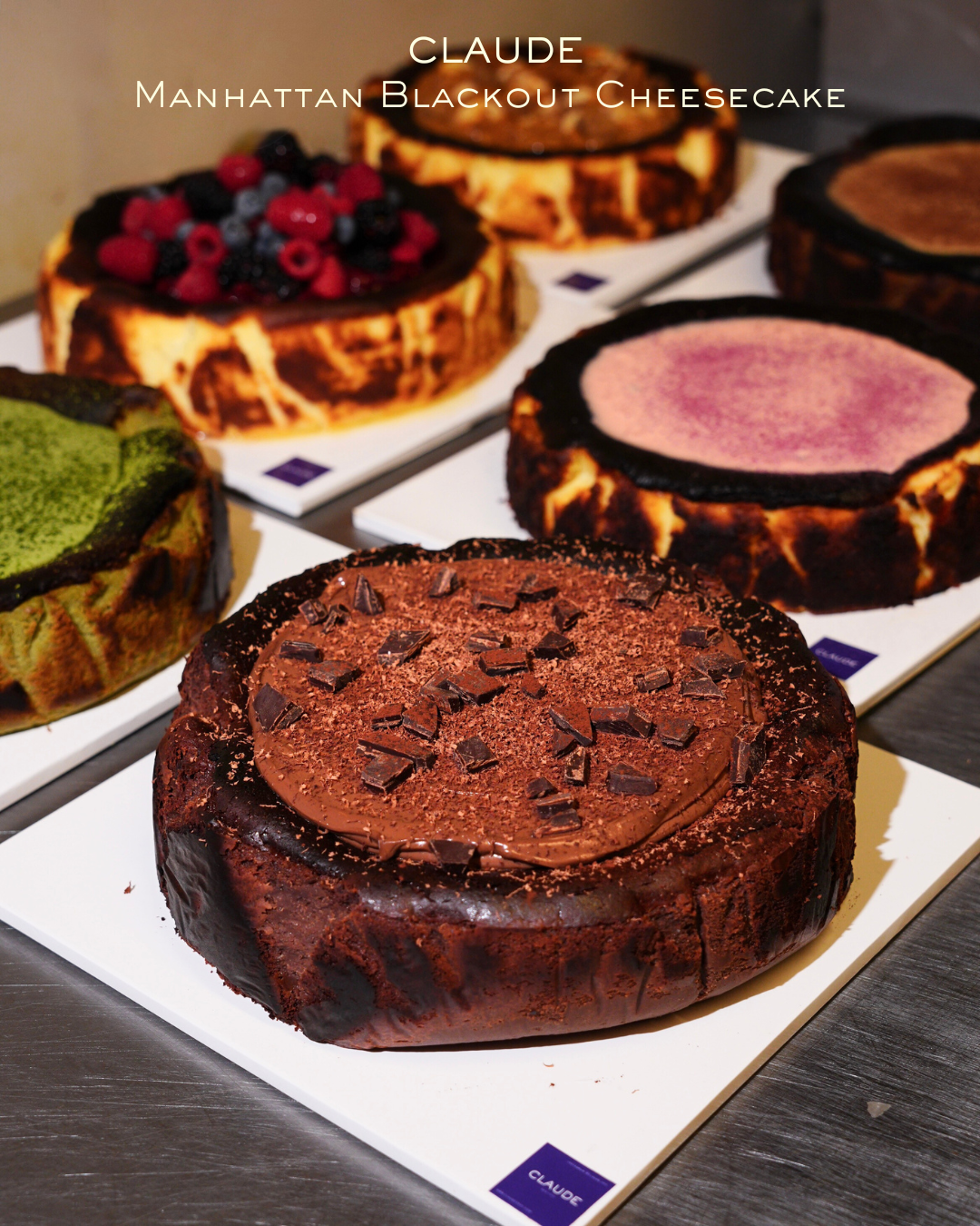 Manhattan Blackout Cheesecake combines a rich Basque-style base with Claude's signature Blackout ganache for an intensely chocolatey finish. Creamy, bold, and unapologetically indulgent.